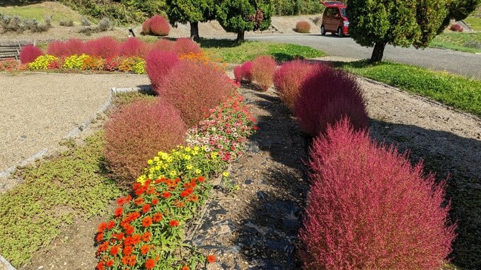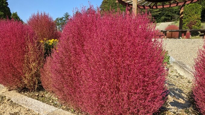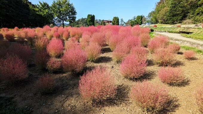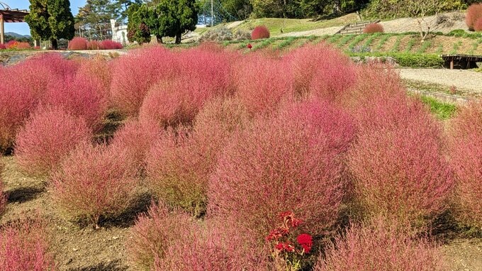 岩手県一関市東山にある唐梅館総合公園にある花壇ではコキアが赤く色づき、訪れた人の目を楽しませています。