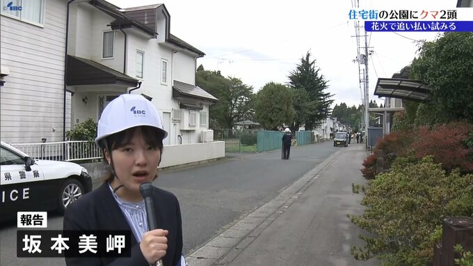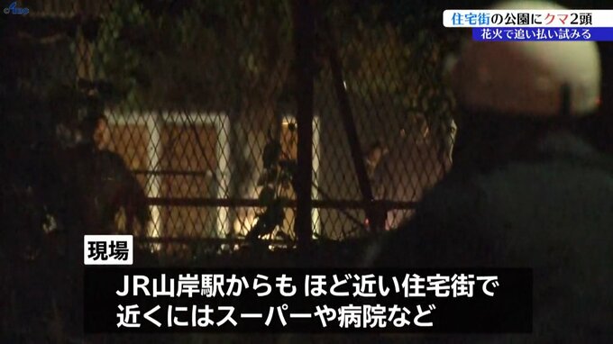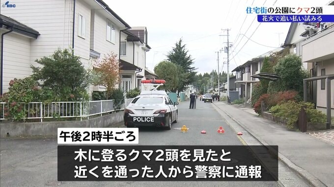22日、盛岡市の住宅街の公園にクマ2頭が出没しました。市と猟友会が花火などを使って追い払おうと試みています。