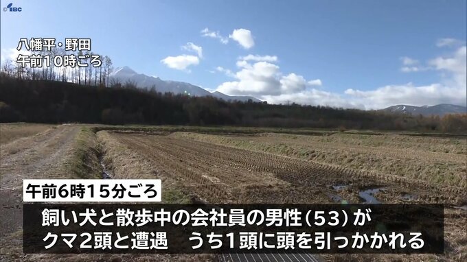 警察によりますと、12日午前6時15分ごろ、八幡平市野駄の自宅近くを飼い犬と散歩していた会社員の50代の男性が、成獣のクマ2頭と遭遇しそのうちの1頭に頭を引っかかれました。