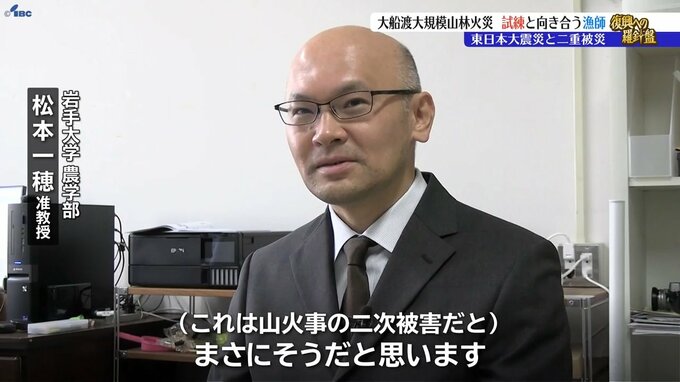 (これは山火事の二次被害だと…)「まさにそうだと思います。今回、山が焼けたことで綾里湾周辺の山の斜面にあった土が水を浸み通しにくくして、それで降ってきた雨が地表面を流れ出して地表面に降り積もったいろんな有機物を押し流して今回のようなことが発生したんだと」