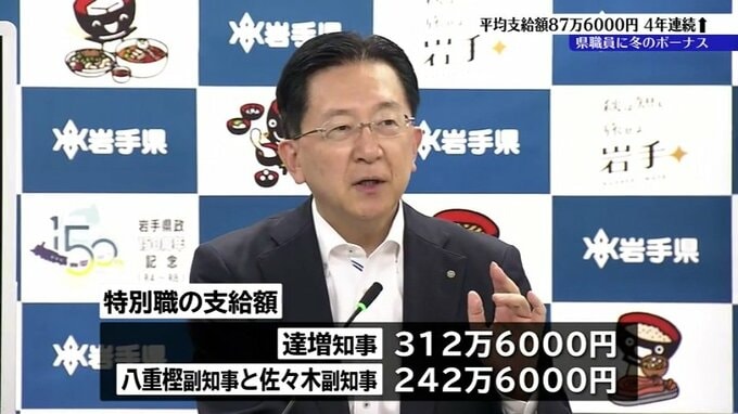 特別職の支給額は達増知事が312万6000円、八重樫副知事と佐々木副知事がそれぞれ242万6000円で、いずれも2024年より増えました。