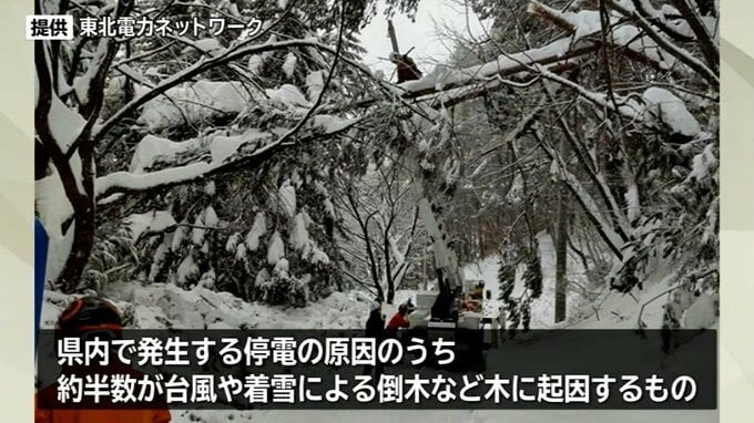東北電力ネットワークによりますと、県内で発生する停電の原因のうちおよそ半数が台風や着雪による倒木など木に起因するものだといいます。