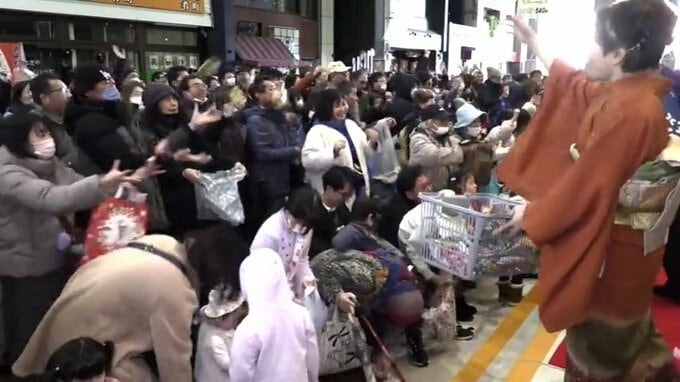 入居するそれぞれの専門店が用意した食料品などの詰め合わせ計1000個を超える福袋を求めて、買い物客が詰めかけました。