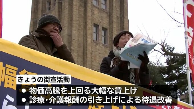 街宣活動では高水準の賃上げは一部の大企業に留まっていて、都市と地方の格差が広がっていると指摘し、2026年春闘では物価高騰を上回る大幅な賃上げが必要と訴えました。
