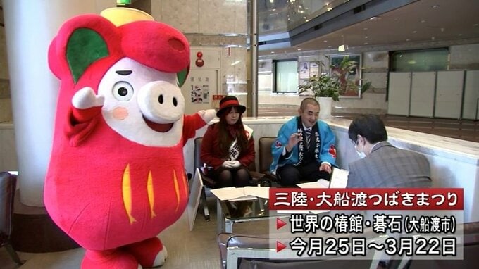 つばき娘やおおふなトンなどのキャラバン隊IBCを訪問 25日にはじまる三陸・大船渡つばきまつりをPR