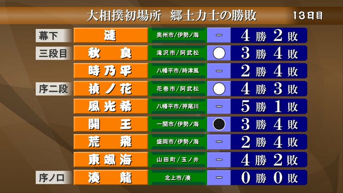 続いては大相撲初場所13日目の郷土力士の勝敗です。