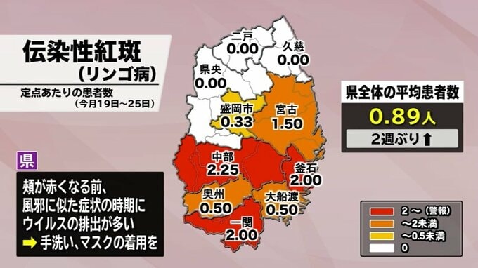また、県内の伝染性紅斑・通称りんご病の患者数の平均は0.89人と2週ぶりに増加しました。