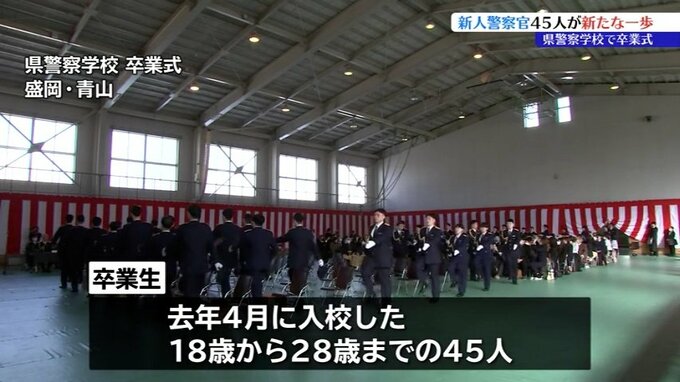 盛岡市の岩手県警察学校で卒業式が行われ、およそ10か月の研修と訓練を終えた45人が警察官としての第一歩を踏み出しました。