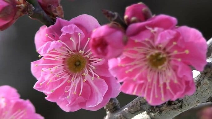 大船渡市の末崎こども園の園庭に植えられた、樹齢100年以上といわれる紅梅が濃いピンク色の花をほころばせています。