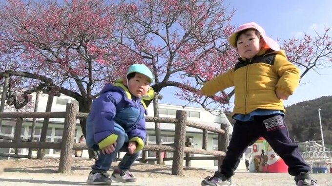 園児たちは、花を見上げながら元気に園庭を駆け回り遊んでいました。