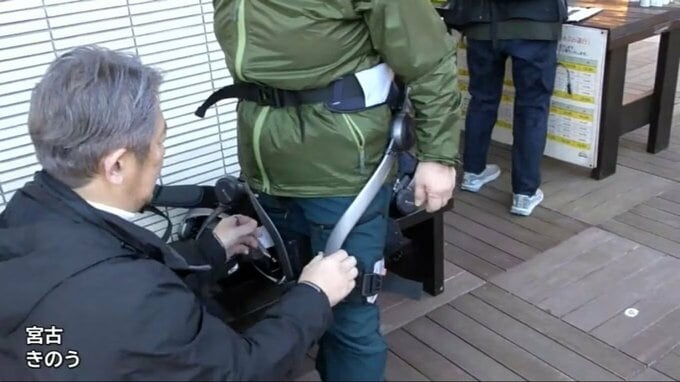 今回、参加者が体験装着したのは利用者の脚力を強化し歩行の負担を軽減する機械「パワードスーツ」です。