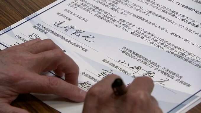 9日は知事や団体の代表者が宣言署にサインし、官民一体で水産業の再生に取り組む決意を新たにしました。
