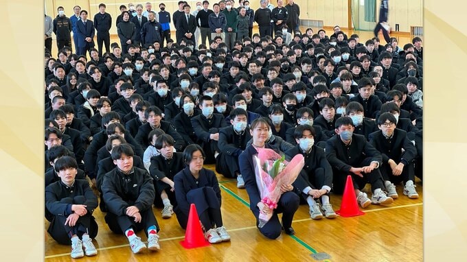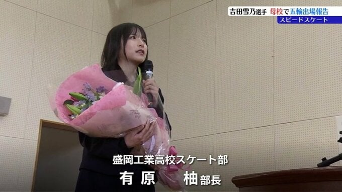 夏場は盛岡工業で一緒にウェイトトレーニングに励むこともあったという、スケート部の後輩有原柚部長から花束を手渡されると笑顔で応えていました。
