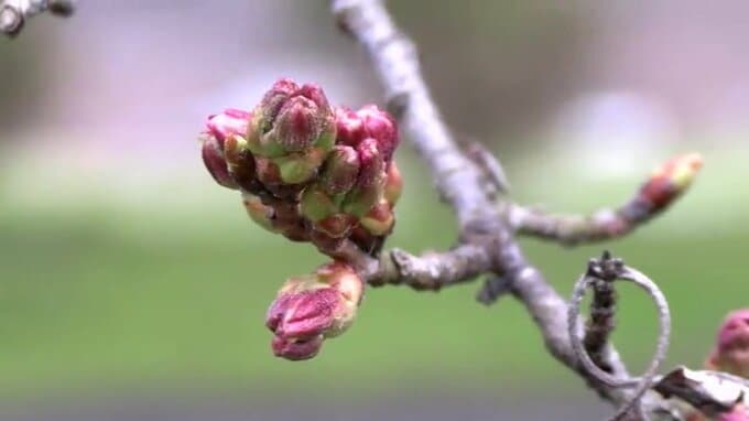 展勝地のサクラは、今は未だつぼみですが、先端がピンクに色着いたものも多く、開花は間もなくとみられます。