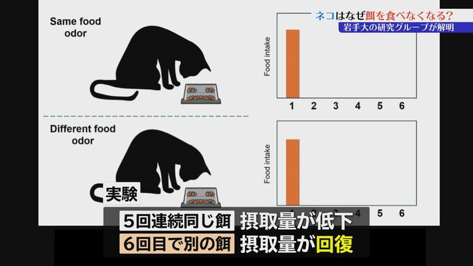 一方、同じ餌を5回連続で与えて摂取量を低下させた後、6回目に臭いの違う別の餌に切り替える実験では、新しい匂いが刺激になり、摂取量が回復することが分かりました。