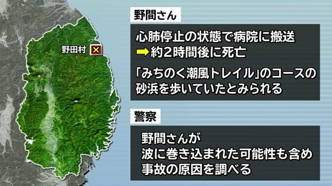 野間さんは「みちのく潮風トレイル」のコースとなっている砂浜を歩いていたとみられます。