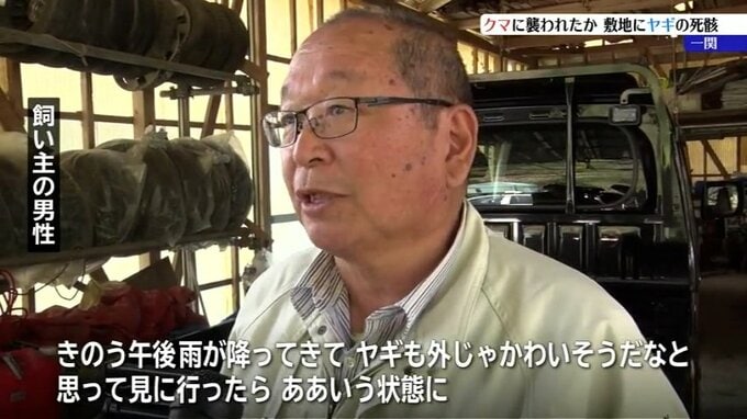 「外に出していたヤギが死んでいる」警察に通報 ヤギの周りにはクマのふん 牙や爪などで皮膚が引き裂かれたような痕 クマに襲われたとみて捜査 岩手・一関市 2026年4月28日(火) 15:32 国内 警察によりますと、ヤギは住宅の敷地内にロープでつながれた状態で、牙や爪などで皮膚が引き裂かれたような痕があり、その場で死んでいたということです。 【現場のようすはこちらから】 (飼い主 千葉規育さん) 「きのうの午後、雨降ってきたんでヤギも外じゃかわいそうだなと思って見さ行ったらばああいう状態に」 【現場のようすはこちらから】 ヤギの周りにはクマのふんが落ちていたことから、警察はクマに襲われたとみて調べています。