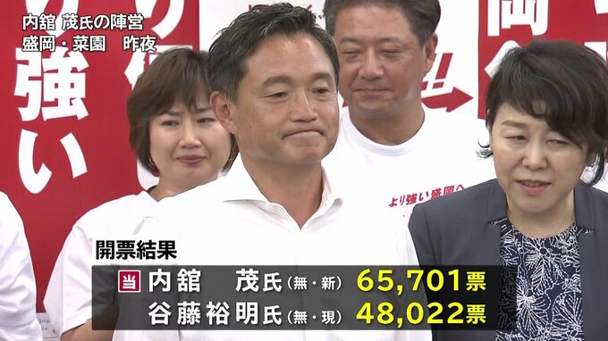 盛岡市長選は内舘茂氏(56)が初当選 3度目の挑戦で現職の6選阻む 1万7679票差 2023年8月14日(月) 10:39 国内 任期満了に伴う盛岡市長選挙は13日投票が行われ、即日開票の結果、新人の内舘茂(うちだて・しげる)氏が初当選を果たしました。盛岡市長選挙の開票結果です。内舘茂 当選 6万5701票谷藤裕明 4万8022票市長…