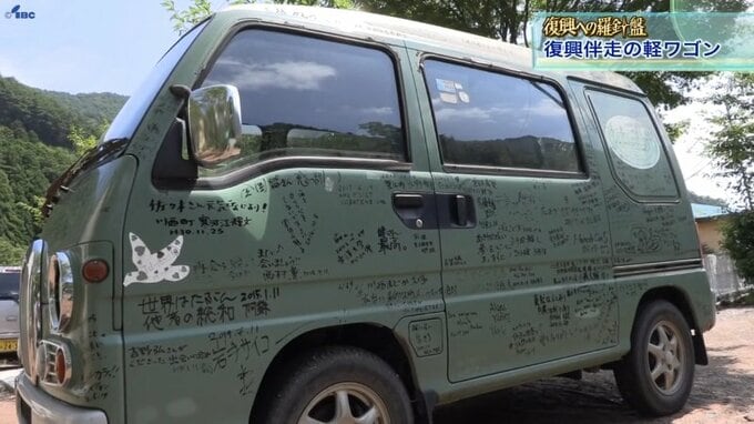 サンバーは津波に車を流された佐々木さんに支援物資として届けられました。車体にはボランティアなどで大槌を訪れた人々の手による、町の復興を願うメッセージがびっしりと書き込まれています。