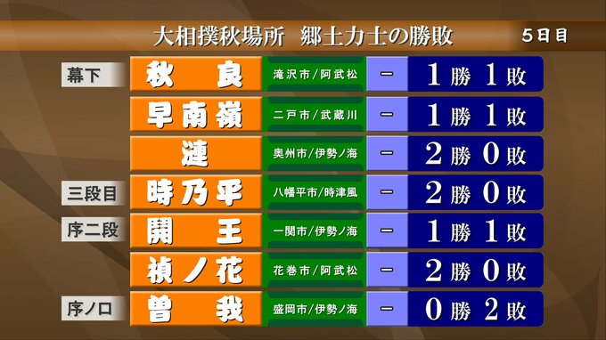 小結の錦木は、福島市出身の関脇・若元春との東北出身同士の取り組みで、寄り切りで敗れました。これで3勝2敗です。