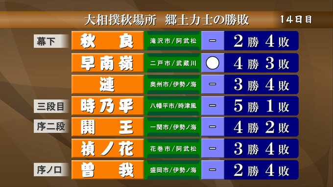 錦木が御嶽海に敗れ5勝9敗 大相撲秋場所14日目 2023年9月23日(土) 18:49 国内 大相撲秋場所14日目。 小結の錦木はすでに勝ち越しを決めた御嶽海に「はたき込み」で敗れて5勝9敗です。 二戸市出身の幕下・早南嶺は丸勝に「寄り切り」で勝って4勝3敗としました。そのほかの郷土力士の取り組みはありませんでした。