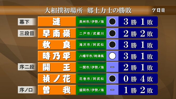 大相撲初場所7日目20日の郷土力士の取り組み結果です。