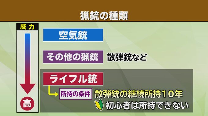 使っているのはハーフライフルと呼ばれる種類の猟銃です。いわゆる「猟銃」は「空気銃」、散弾銃を含む「その他の猟銃」、「ライフル銃」の3種類に分かれ、ライフル銃は威力が高く原則として散弾銃の継続所持10年以上という条件があり、初心者は所持できません。しかしハーフライフルは、「その他の猟銃」に当たるため狩猟免許をとったばかりの初心者でも所持できます。