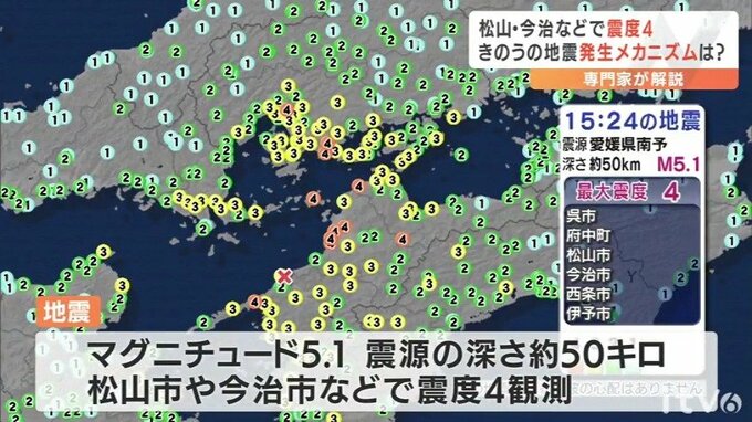 26日午後、愛媛県の南予地方を震源に最大震度4の地震が発生しました。地震はどのようなメカニズムで起きたのか。また南海トラフ地震との関連について、専門家に話を聞きました。