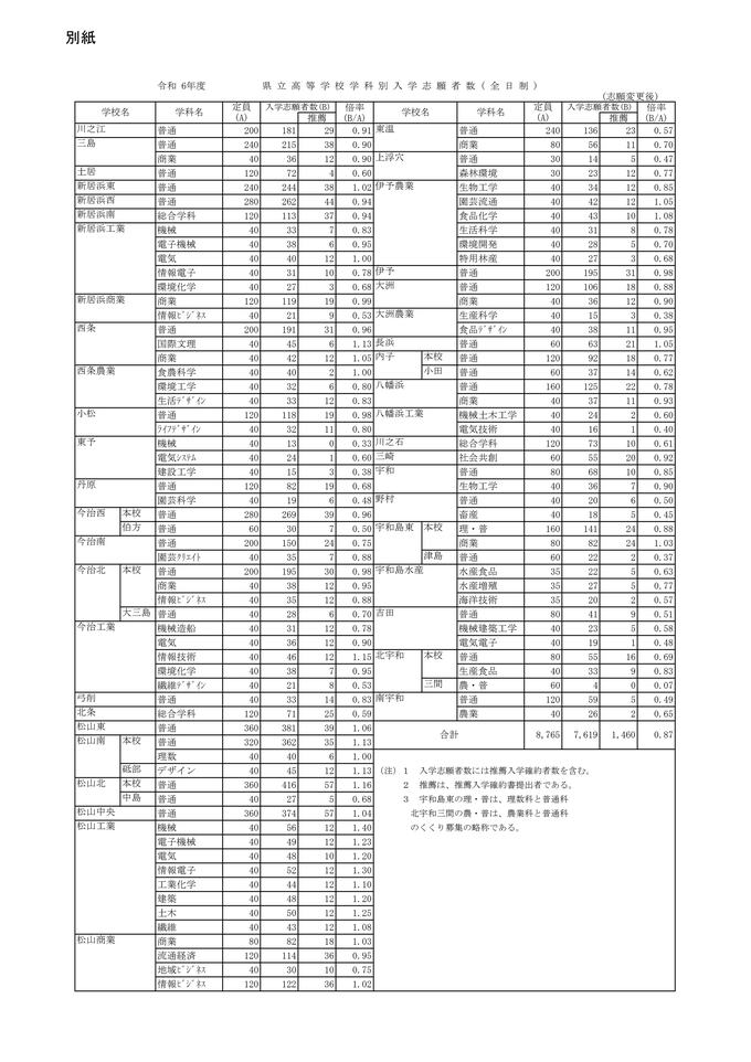 愛媛県立高校一般入試の志願変更が、29日正午で締め切られました。全日制の志願倍率は全体で0.87倍となっていて、10年連続で1倍を下回っています。