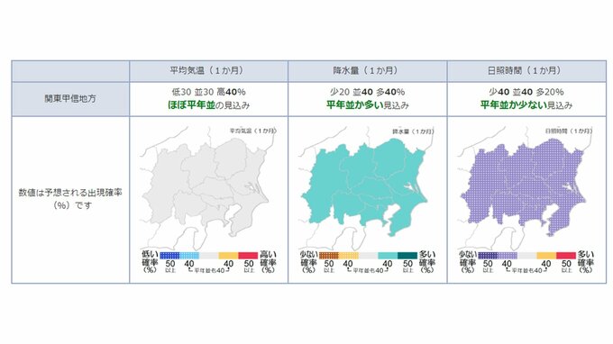 関東甲信地方の向こう1か月の気温はほぼ平年並ですが、期間のはじめは寒気の影響を受けやすいため平年並か低く、その後は寒気の影響を受けにくいため平年並か高いでしょう。
