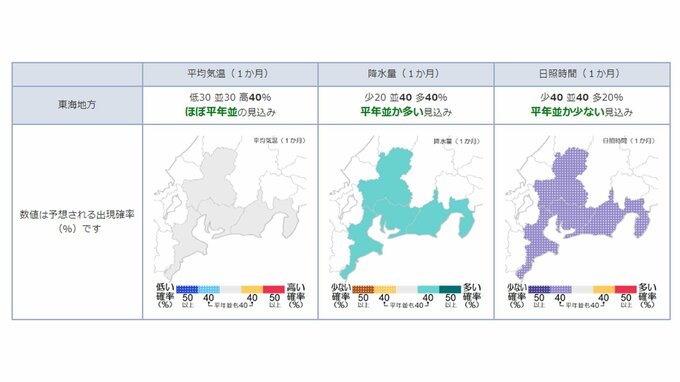 東海地方の向こう1か月の気温はほぼ平年並ですが、期間のはじめは寒気の影響を受けやすいため平年並か低く、その後は寒気の影響を受けにくいため平年並か高いでしょう。