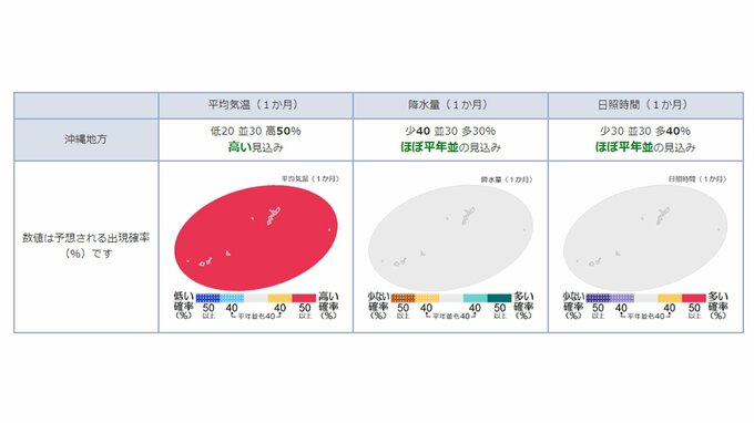 沖縄地方の向こう1か月の気温は高いでしょう。期間のはじめは寒気の影響で平年並か低いですが、その後は暖かい空気に覆われやすいため、かなり高くなる可能性があり、気温の変動が大きい見込みです。
