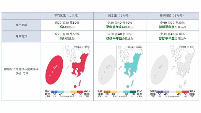 九州南部では、低気圧や前線の影響を受けやすいため、向こう1か月の降水量は平年並か多いでしょう。