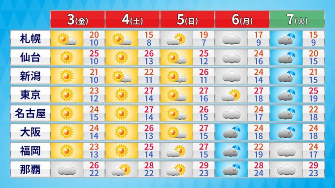 東京でも4日(土)から6日(月)の最高気温は27℃で、夏日が予想されています。
