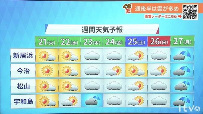 21日(火)は日差しが強く夏日続出か 熱中症に注意【愛媛の天気】 2024年5月20日(月) 19:25 国内 気象予報士の竹之熊和也が徹底解説!“くま天”<21日(火)の天気ポイント>日差しが強く夏日続出<21日(火)の天気>高気圧におおわれて、おおむね晴れるでしょう。天気の崩れはなく、洗濯日和となりそうです。最低気温…