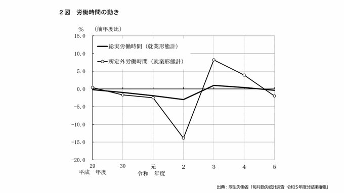 実質賃金減 物価高が影響 林長官「中小企業の賃上げを強力に後押し」厚生労働省「毎月勤労統計調査」 2024年5月23日(木) 15:30 国内 残業時間はどう変化? 就業形態計の所定外労働時間は、令和4年度の3.9%増から減少に転じ、2.0%減の10.0時間となった。