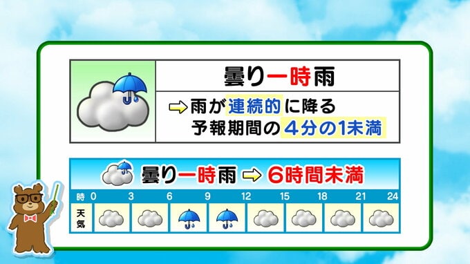 予報期間をあす1日、0時~24時のとします。まず、『一時雨』というのは、1日のうちの4分の1よりも少ない時間が雨ということ。