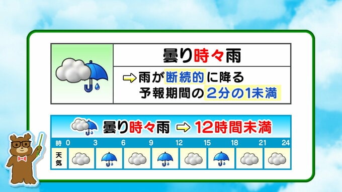一方、『時々雨』の場合、1日のうち2分の1より少ない時間が雨ということ。