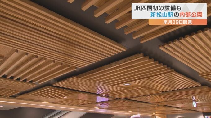 「まず内装材につきまして、コンコースや待合室で使用されている材木は、愛媛県産のスギとヒノキです。こちらのコンコースの格子天井につきましては、愛媛の伝統織物『伊予絣』の『井桁模様』をモチーフにデザインしております。こちらの天井が1階から2階に向けて連続することで、お客様の動線方向を視覚的に作り出す狙いがございます」