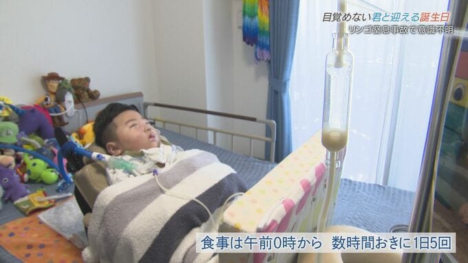 食事は午前0時から数時間おきに1日5回。栄養剤を鼻から通した管で胃に送ります。
