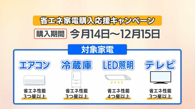 愛媛県が電気料金の負担軽減などを目的に始める「省エネ家電購入応援キャンペーン」。対象となるのは、9月14日から12月15日までの期間に購入した、国が定めた省エネ性能の基準を満たしているエアコン、冷蔵庫、LED照明、テレビです。1つの製品につき3万円を上限に、本体価格の半分が補助されるというものです。愛媛県内のスーパーや百貨店などで使える商品券で還元されます。