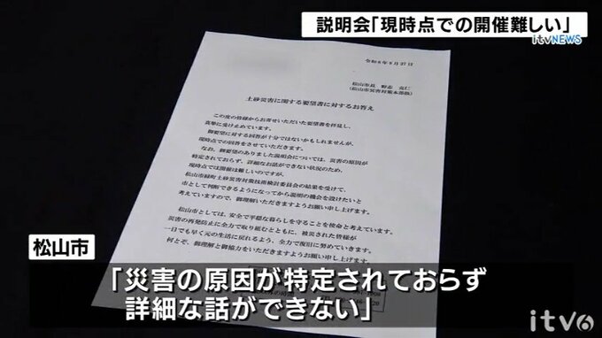 「現時点での開催は難しい」松山城山土砂崩れ 被災マンション住民 説明会の要望に松山市から回答 愛媛・松山市 2024年9月28日(土) 19:02 国内 松山城の城山斜面が崩れた土砂災害で被害を受けたマンション住民が愛媛県松山市に求めていた説明会の開催について市は昨夜住民に対し、「現時点での開催は難しい」と文書で回答しました。今年7月に起きた土砂…
