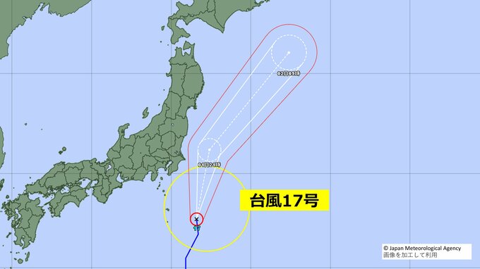 気象庁によりますと、台風17号は、1日は発達しながら伊豆諸島の東から関東の東を北上し、2日朝には温帯低気圧に変わって北海道の東に進む見込みです(今後の進路、雨の予想は画像でご覧いただけます)。