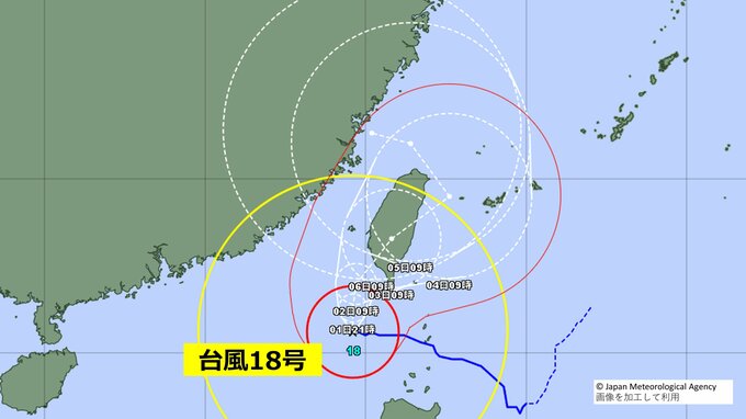 台風18号は、1日は南シナ海をゆっくりとした速さで北西へ進み、2日は進路を北東に変えて台湾付近に進んだ後、3日から4日頃にかけて、暴風域を伴って沖縄地方に接近するおそれがあります。