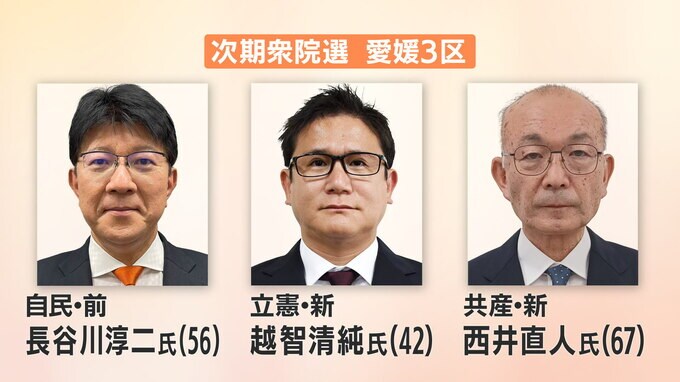 最後に愛媛3区です。自民党の前職・長谷川淳二氏、立憲民主党の新人・越智清純氏、共産党新人の西井直人氏の3人です。