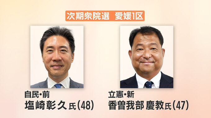 愛媛1区は、自民党の前職・塩崎彰久氏、立憲民主党の新人・香曽我部慶教氏、共産党の新人・石本憲一氏、国民民主党の新人・石井智恵氏の4人です。