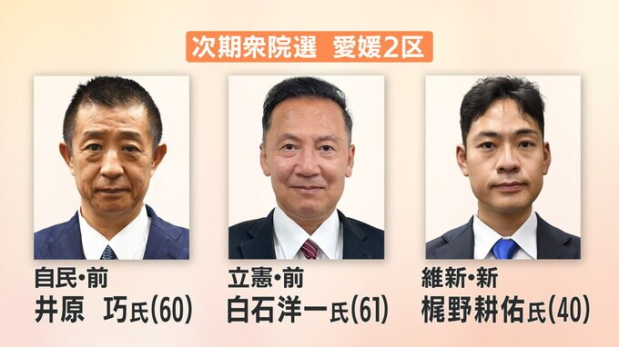 続いて愛媛2区です。自民党の前職・井原巧氏、立憲民主党の前職・白石洋一氏、日本維新の会の新人・梶野耕佑氏が立候補を予定しています。