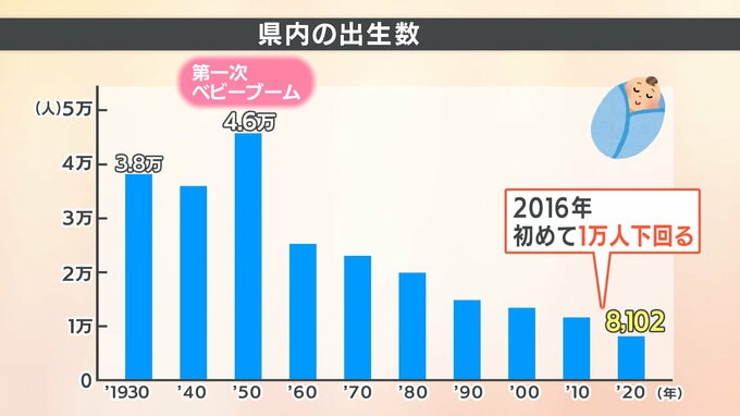1930年は約3万8000人、その後1950年ごろの第一次ベビーブームをピークに右肩下がりとなっていて、2016年に初めて1万人を下回りました。