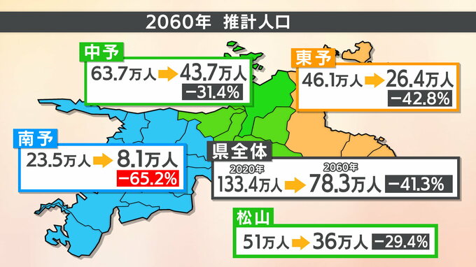 地域ごとでは東予が42.8%減少、中予が31.4%減少、南予に至っては65.2%減少し、2060年には地域全体で約8万人になるという試算が示されました。