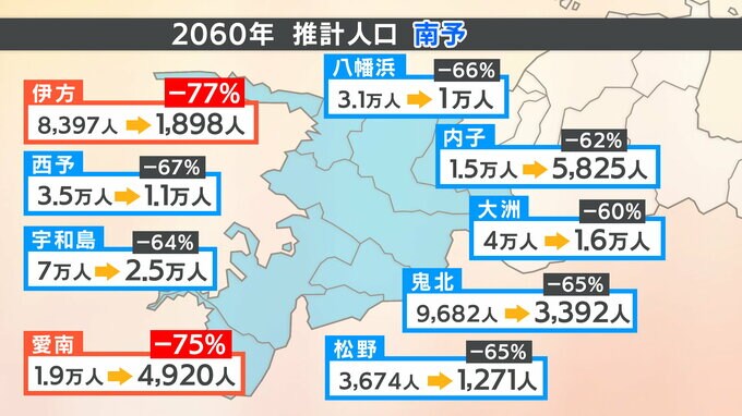 このほか、内子町・大洲市・八幡浜市・西予市・鬼北町・松野町・愛南町もすべて60%以上減少する試算となっています。